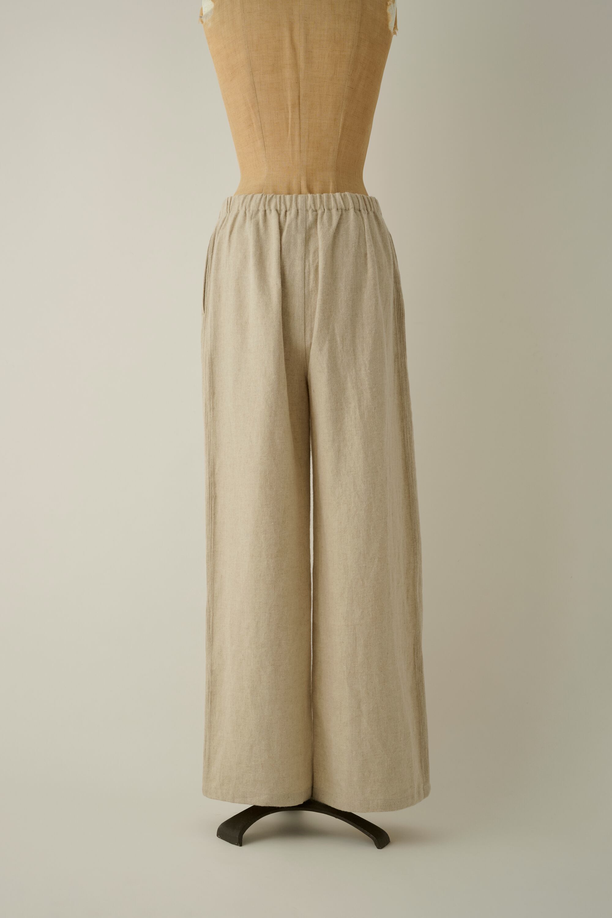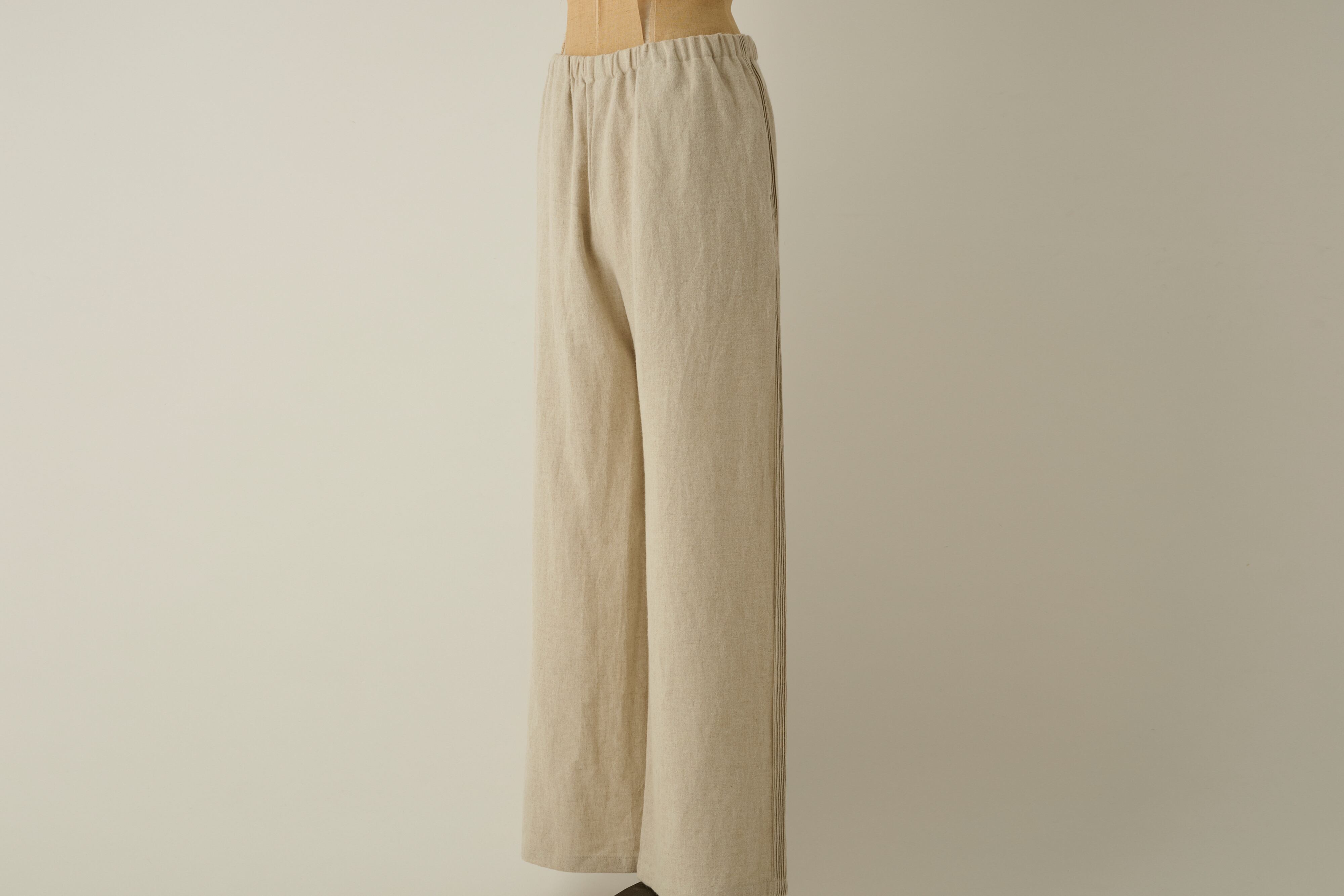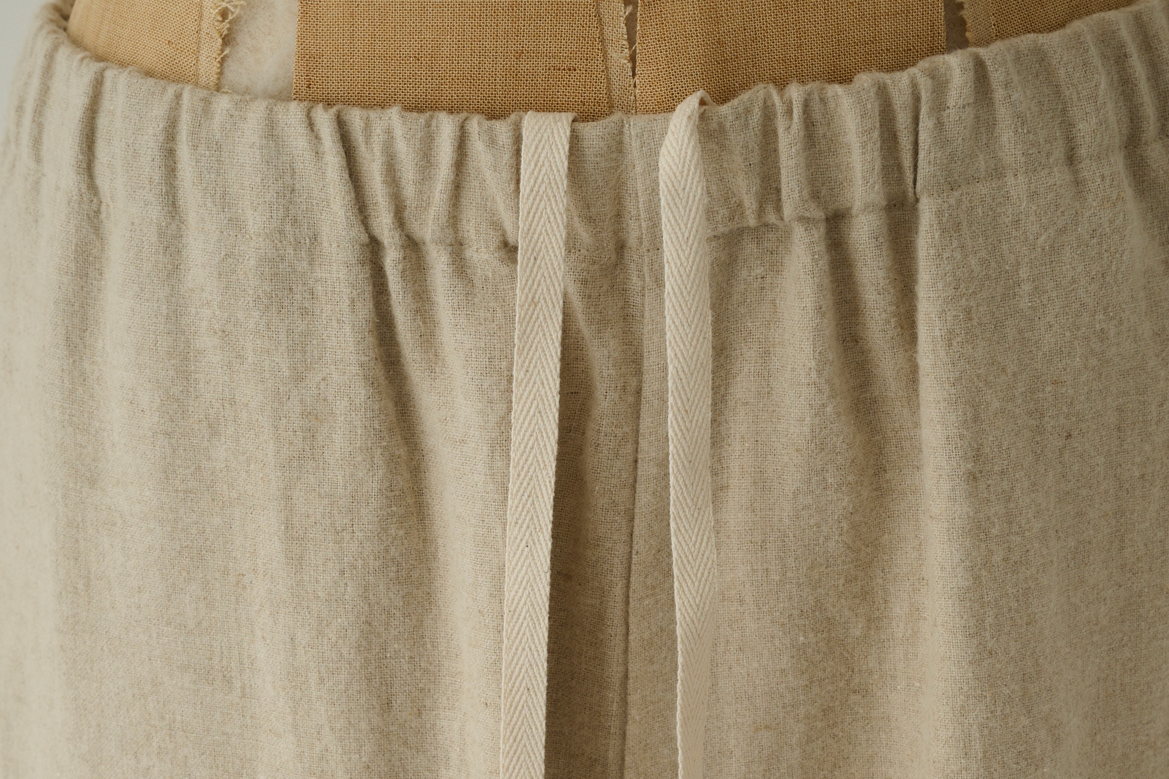 ウェスト部分はゴム+紐の仕様になっており、就寝時や移動時のリラックスウェア、アクティブな活動時にも着用可能です。美しいストレートシルエットは、天然素材でありながら、クラス感のある品性を持ち合わせております。